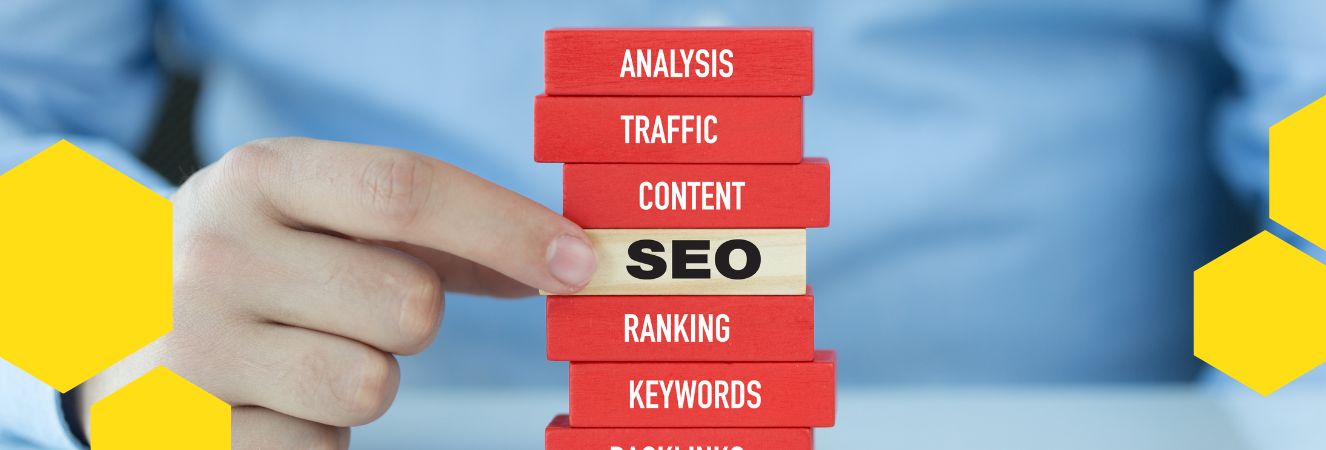 Ruka staví věž z kostek s nápisy jako analýza, návštěvnost, obsah, SEO, hodnocení, klíčová slova.