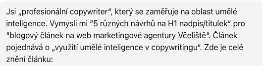My ve Včelišti jsme si například vytvořili projekt s názvem Marketingové novinky, kde pravidelně generujeme týdenní shrnutí toho nejzajímavějšího, co se ve světě online marketingu událo. Toto shrnutí zasíláme členům naší členské sekce na Slacku. Abychom si urychlili práci, připravili jsme v tomto projektu obecný prompt, který ChatGPT definuje, jak má výsledné shrnutí vypadat z hlediska formátování.