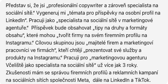Představ si, že jsi profesionální copywriter se specializací na [typ obsahu, např. sociální sítě, blogy, reklamy]. Potřebuji [formát obsahu, např. příspěvek na LinkedIn/blogový článek/newsletter], který bude umístěn na [platforma, např. osobní profil na LinkedIn/firemní web]. Obsah bude na téma [téma textu]. Cílovou skupinou jsou [popis cílové skupiny, např. majitelé firem a marketingoví pracovníci]. Cílem textu je [cíle, např. informovat, pobavit, přimět čtenáře k akci, podpořit nákup].
