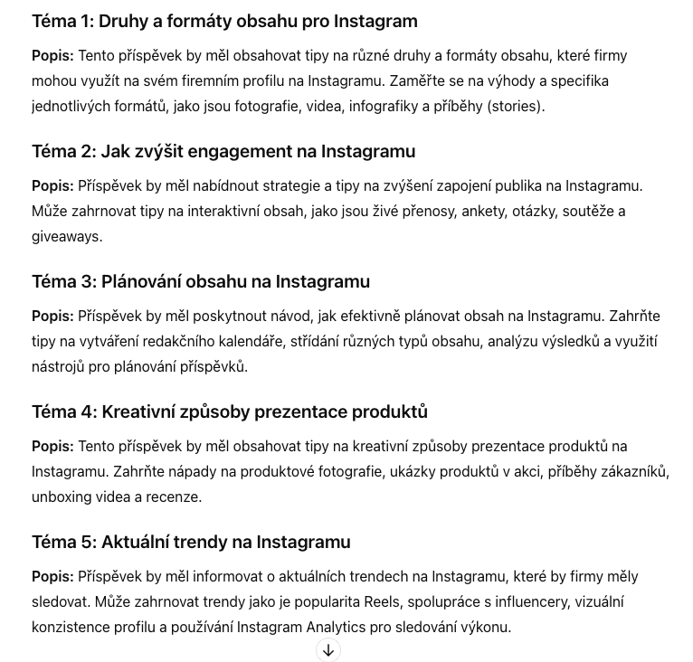 Nechte si vygenerovat nápady na obsah, například témata blogových článků nebo příspěvků na sociální sítě. Následně zadejte AI přípravu osnovy, podkladů nebo analýzy klíčových slov pro vybrané téma.