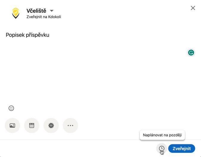 Případně si je můžete rovnou naostro naplánovat ke zveřejnění pomocí různých nástrojů. Na Facebooku a Instagramu využijte třeba plánovač v Meta Business Suite. Na LinkedInu pak můžete plánovat příspěvky pomocí ikonky hodinek vedle tlačítka Zveřejnit.