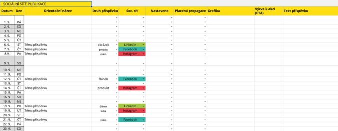 Stanovte si předem jeden den v týdnu, který zasvětíte týdenním aktivitám. V tento den si zkontrolujte, že vám nic z denních činností neuteklo, a také si připravte příspěvky na další týden. Rozepsat si je můžete jako koncepty do tabulky s již finálními texty a grafikou, aby vám publikace v určený den zabrala jen pár minut.
