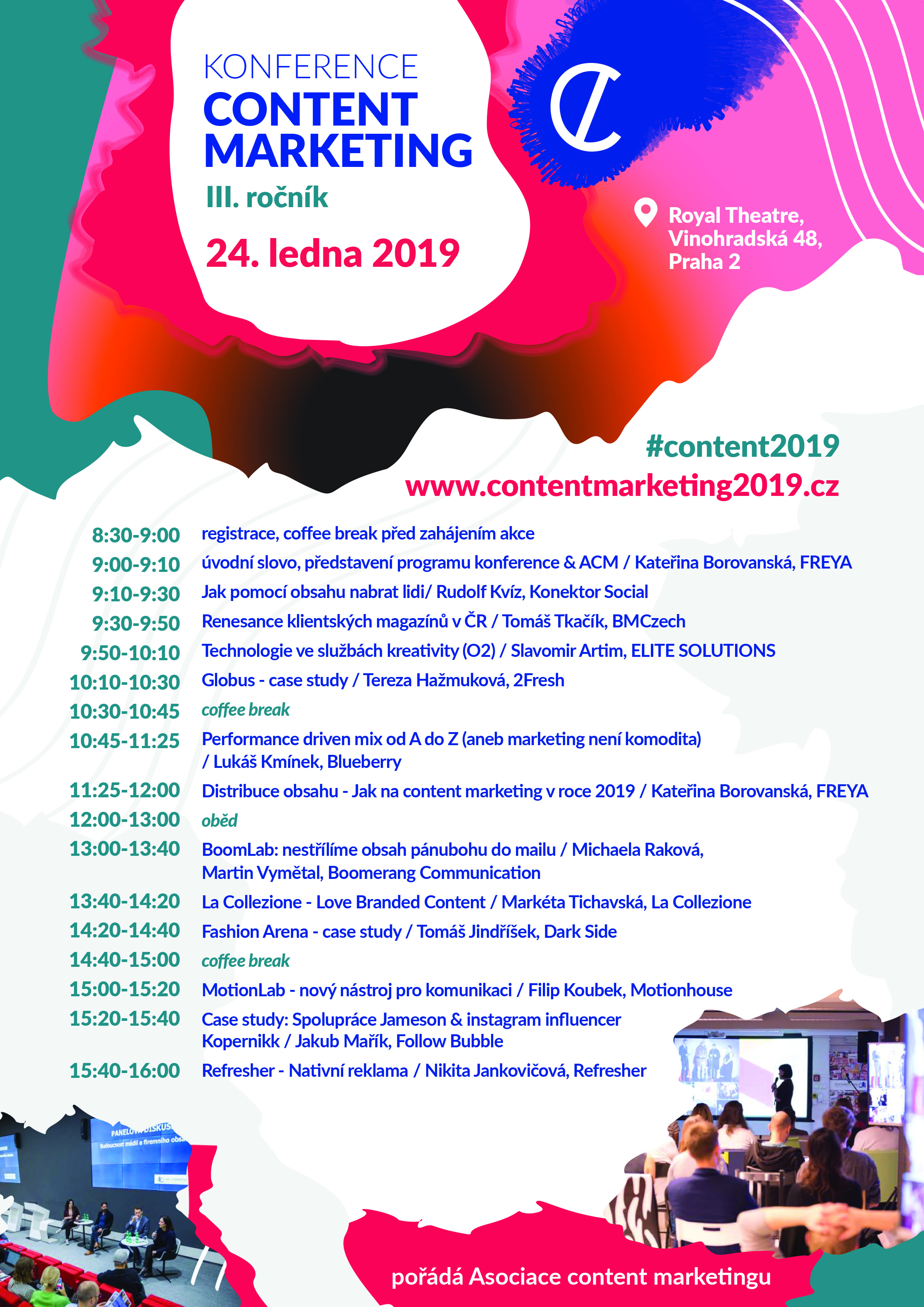 Téma konference: Konferenci, na níž nemůže nikdo, kdo se zabývá obsahem, chybět, pořádá Asociace content marketingu (ACM). Vybraní specialisté vám poradí, jak pomocí obsahu zaujmout a získat klienty či zákazníky.