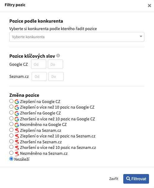 Český SEO nástroj upravil funkci přehled konkurence, kde můžete nově použít například pokročilé filtry pro klíčová slova.