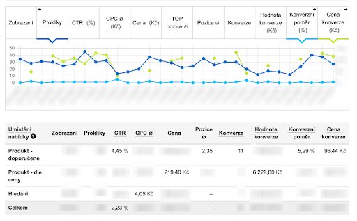 Výhodou je také snadná integrace přes XML feed a dostupné analytické nástroje pro optimalizaci kampaní. Díky napojení na Sklik je možné efektivně kombinovat produktové inzerce s dalšími typy reklamy. Výkon kampaní lze sledovat v přehledném rozhraní, které nabízí statistiky o zobrazeních, proklicích a konverzích, viz obrázek: