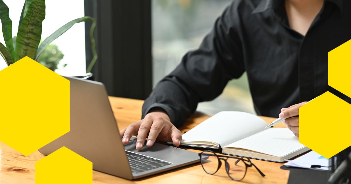 Osoba píšící poznámky do notebooku při práci na laptopu, zaměřená na SEO copywriting.