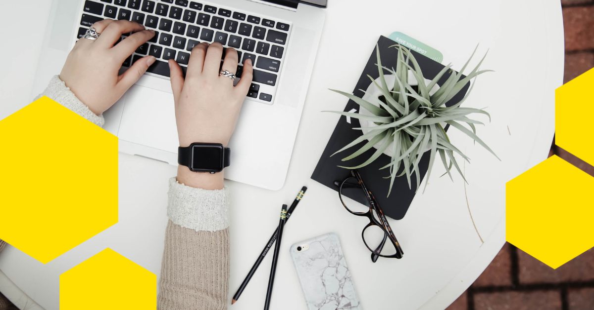 Ruce na klávesnici notebooku, vedle leží brýle, telefon a rostlina, symbolizující správu sociálních sítí.