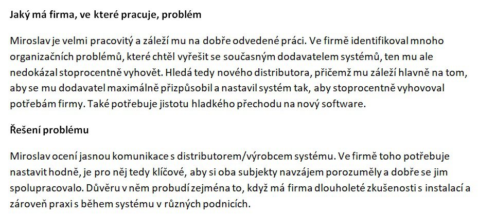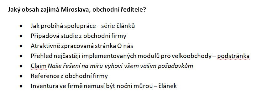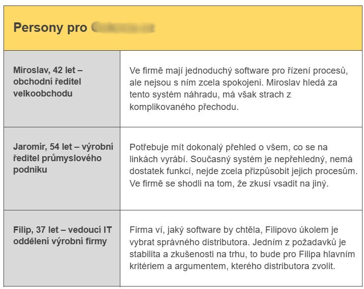 Jak už jsme zmínili, v B2B sektoru se musíte zaměřit zejména na firmu jako takovou a pracovní problémy konkrétní persony. Stručný souhrn person pro jednoho z našich klientů vypadal takto: