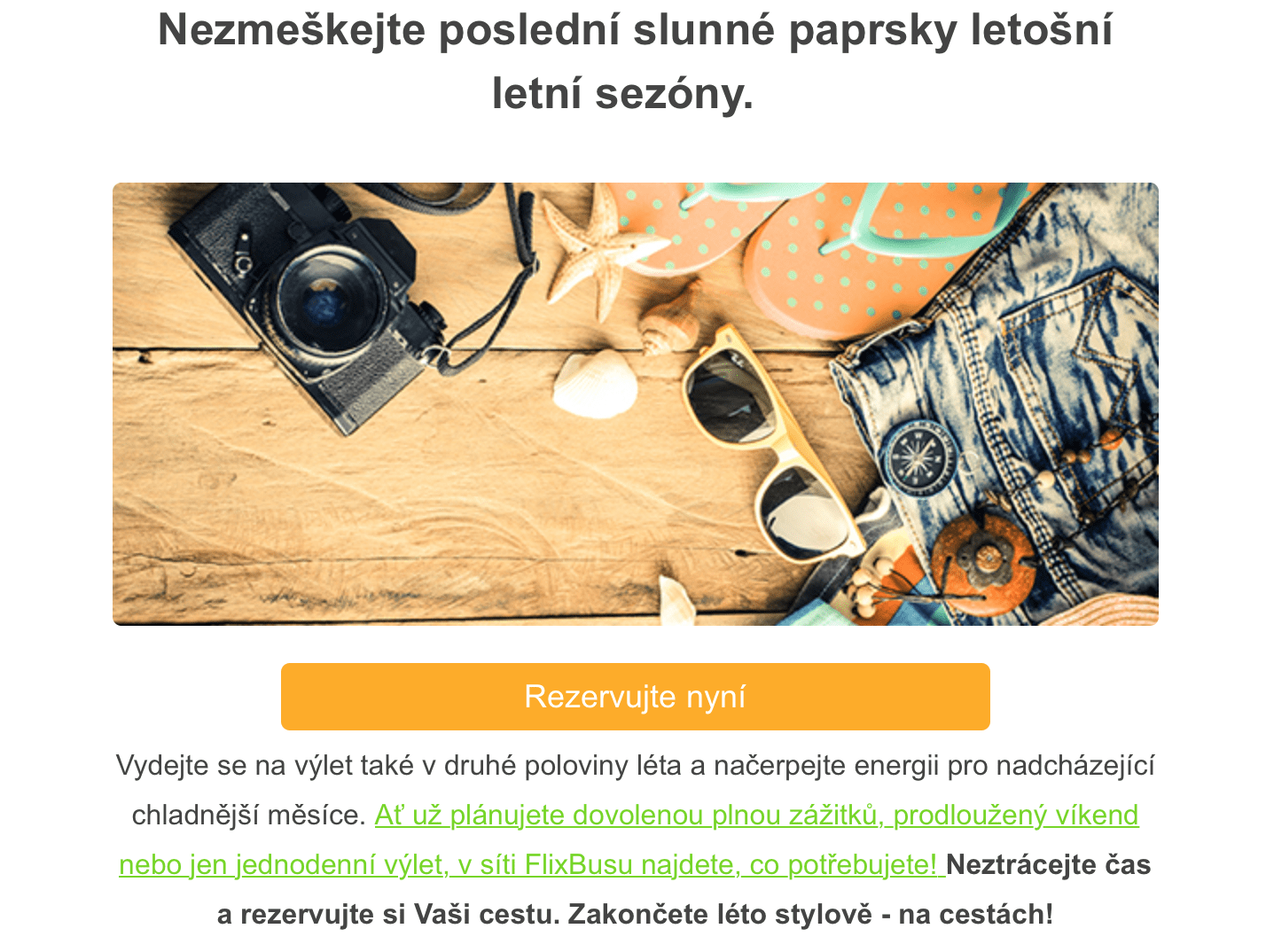 CTA v e-mailu – jedním z nejdůležitějších komponentů každé e-mailingové kampaně je právě CTA. Upoutá pozornost vašich odběratelů a ideálně je přiměje k akci. V e-mailu působí nejlépe CTA založené na jednoduchém textu. Některé e-mailové schránky mohou zdeformovat vaši povedenou grafickou práci, což by byla škoda. Navíc odkazy přímo v textu nepůsobí tak naléhavě a jsou mnohem osobnější.
