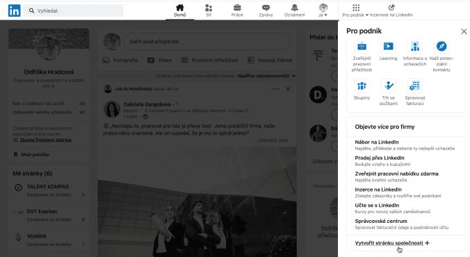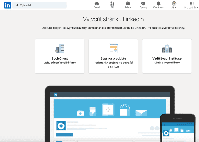 Na svém profilu poté můžete vyplnit krátký popisek o vás, své povolání, vzdělání, předchozí pracovní zkušenosti i dovednosti. Pokud už osobní profil máte založený z dřívějška, můžeme tuto fázi přeskočit a vrhnout se rovnou na ten firemní. V hlavním menu vyberte záložku Pro podnik a úplně dole klikněte na Vytvořit stránku společnosti.