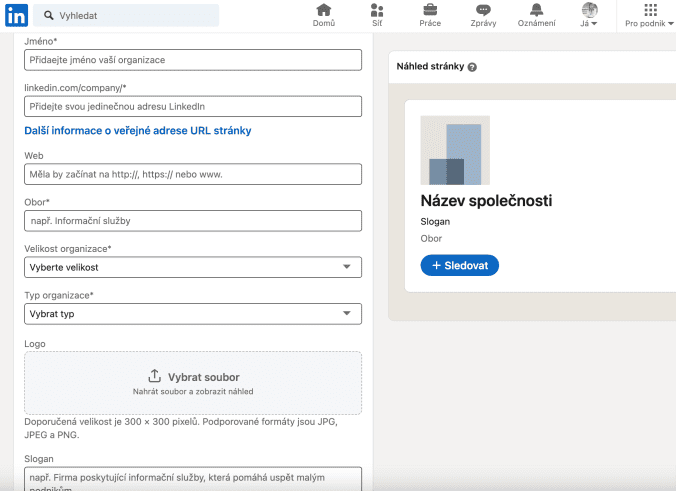 Teď už jen stačí zadat informace o firmě. Konkrétně její název, webovou stránku, obor působení, velikost a typ společnosti, její logo a také slogan, neboli krátký popisek firmy. Všechny tyto informace můžete v budoucnu upravovat ve svém profilu.