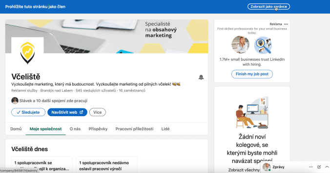 Až budete mít vše vyplněno, kliknutím na tlačítko Vytvořit stránku založíte profil své společnosti. Poté budete mít při každé jeho návštěvě možnost volby mezi dvěma zobrazeními stránky. Pokud si stránku zobrazíte jako člen, uvidíte ji jako každý jiný návštěvník. Až budete chtít provádět úpravy či přidávat příspěvky, vyberte variantu Zobrazit jako správce.
