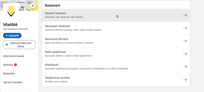 Pokud chcete do správy firemního profilu zapojit i své kolegy, stačí jim přidělit status správce. Tuto možnost naleznete v levém sloupci na vašem firemním profilu v sekci Nastavení.