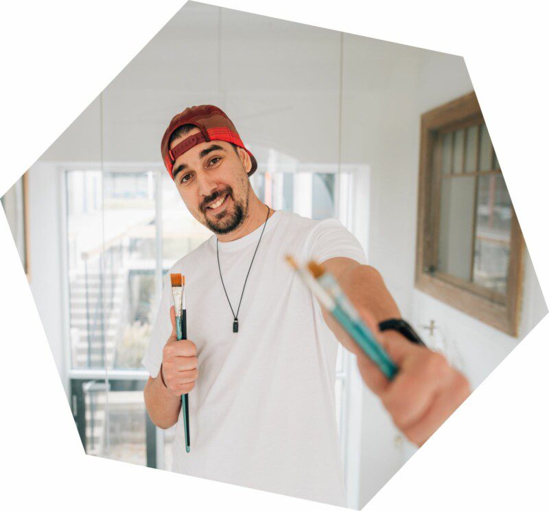 Muž s čepicí drží štětce v moderním interiéru, symbolizující kreativitu v online marketingu.