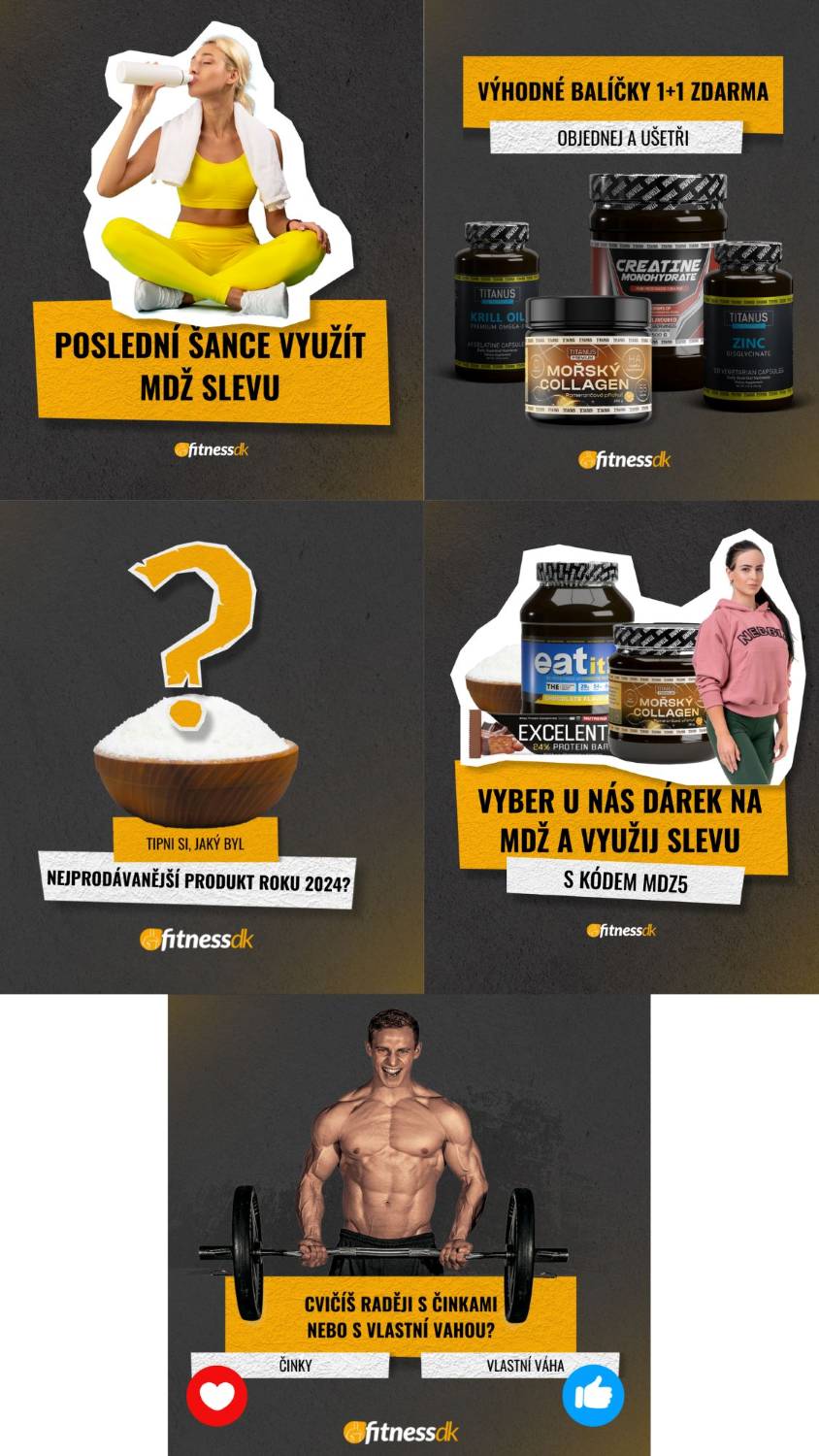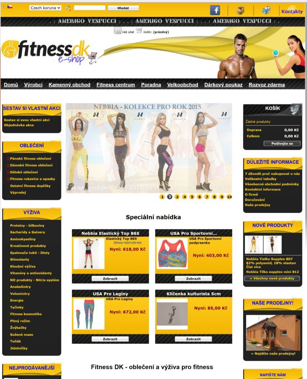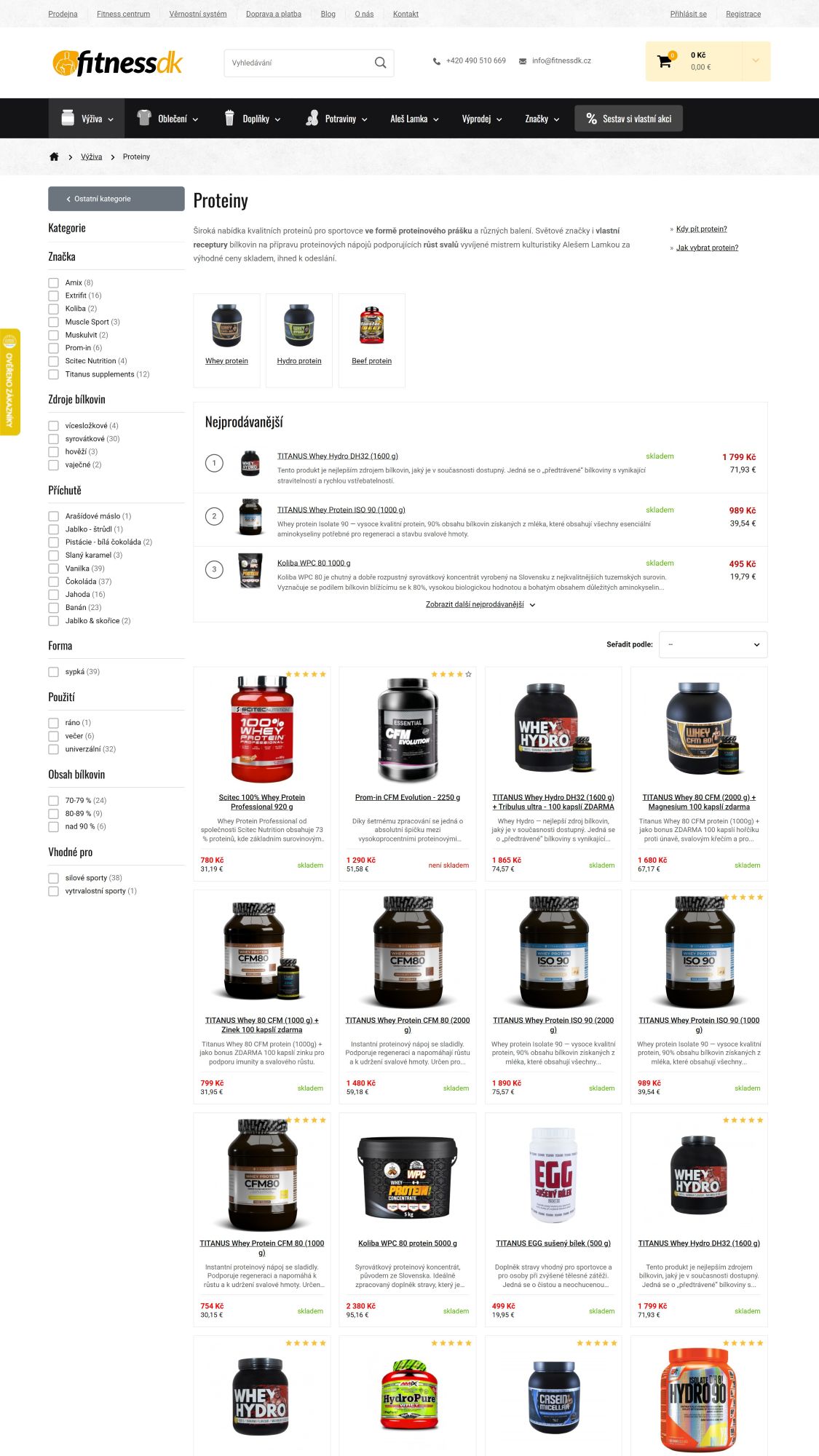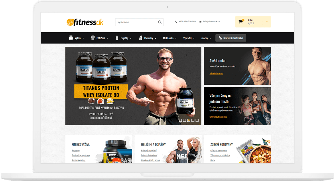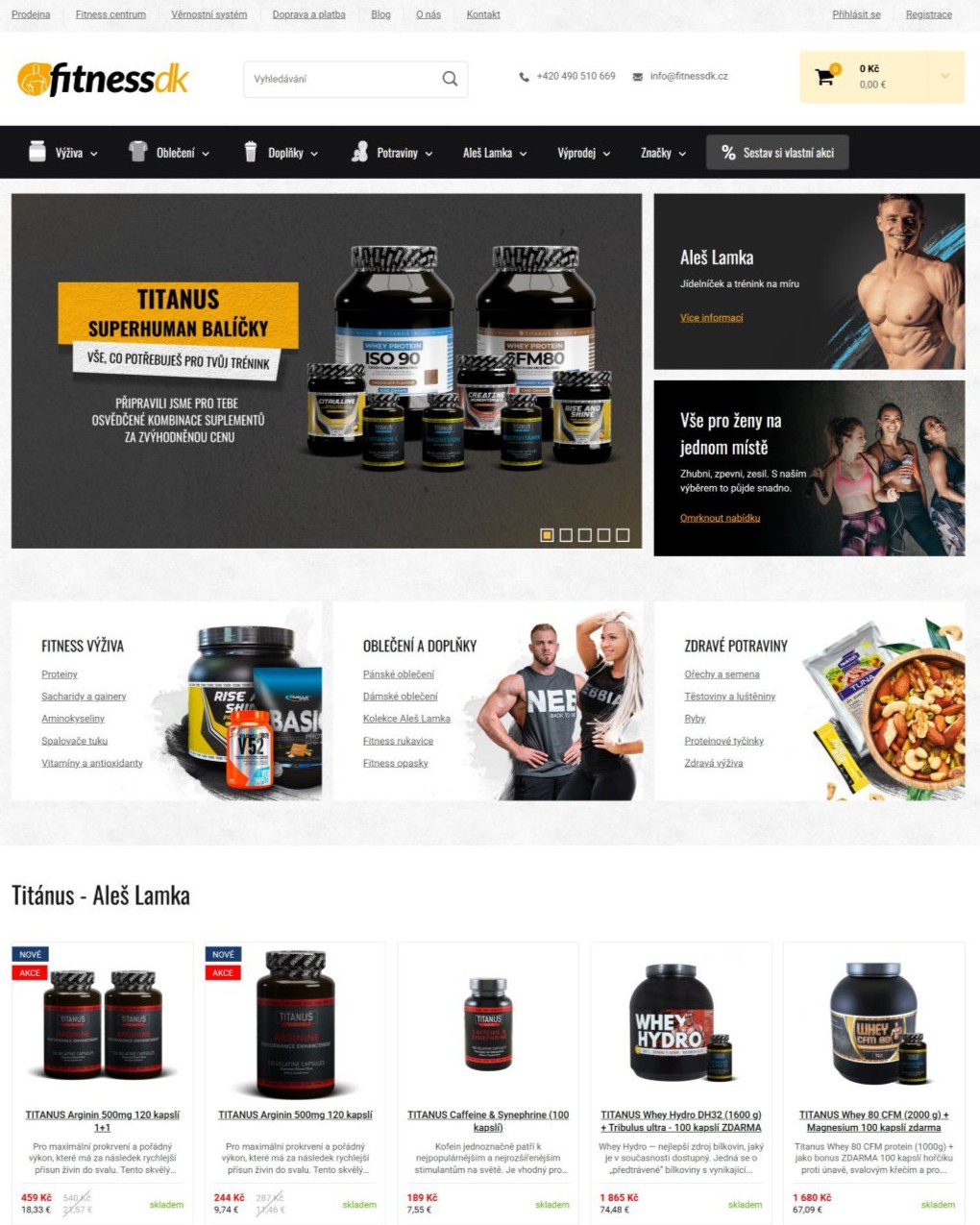 Webová stránka FitnessDK s nabídkou proteinových doplňků a fitness oblečení.