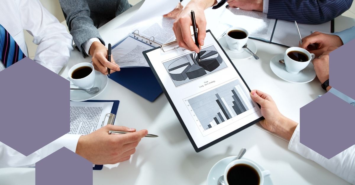 Tři lidé v obchodním oblečení házejí šipky na terč šipkové tabule na stole pokrytém tabulkami a dokumenty, což symbolizuje týmovou práci a společné cíle. Obrázek zdobí žluté geometrické tvary.