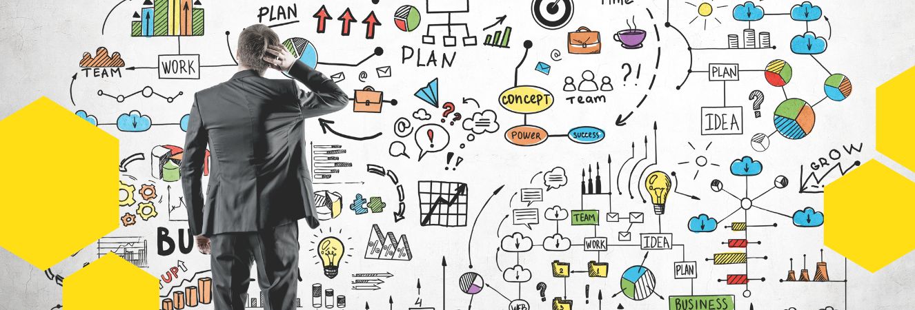 Muž přemýšlející nad schématem obsahového marketingu s grafy a diagramy na zdi.