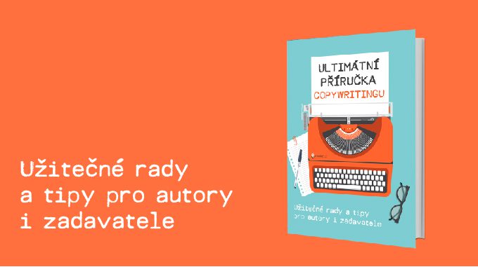 Obálka e-booku Ultimátní příručka copywritingu s psacím strojem na oranžovém pozadí.