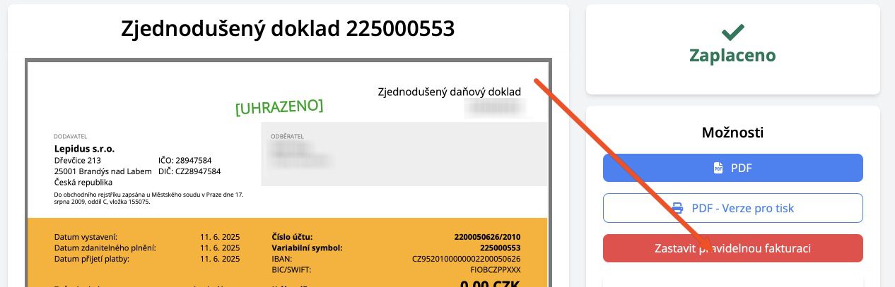Členství může kupující kdykoliv ukončit sám na přehledové stránce objednávky, na kterou najde odkaz v každém e-mailu s dokladem za členství od nás. Na ní kliknete na červené tlačítko Zastavit pravidelnou fakturaci.