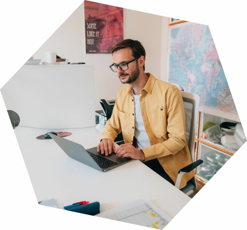 Muž pracující na notebooku v kanceláři, zaměřený na SEO strategie.