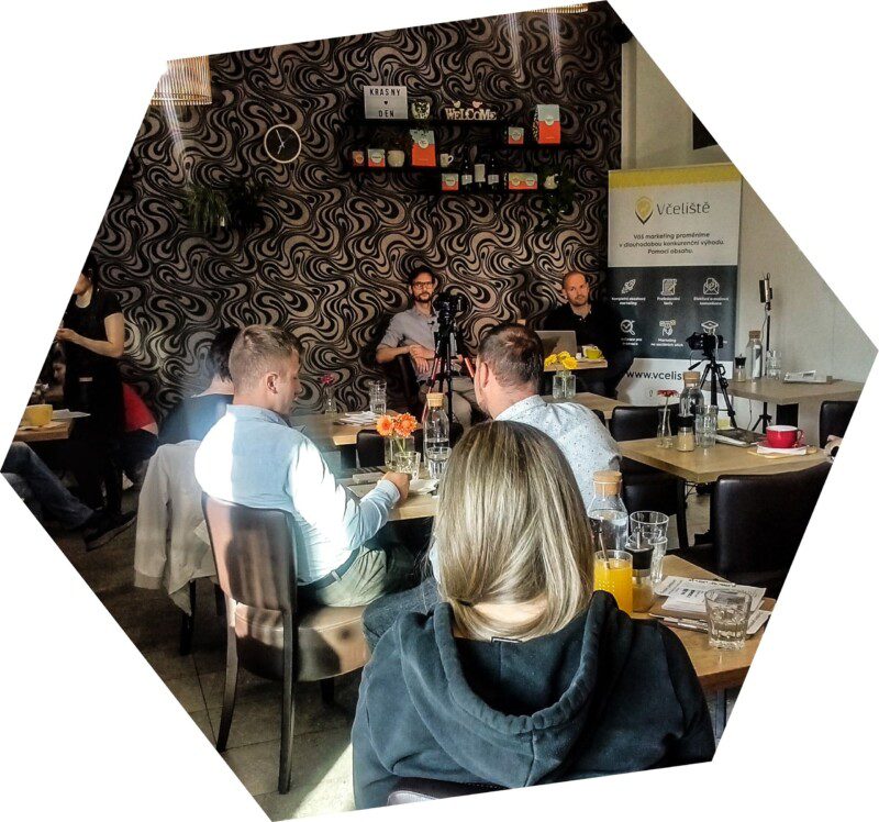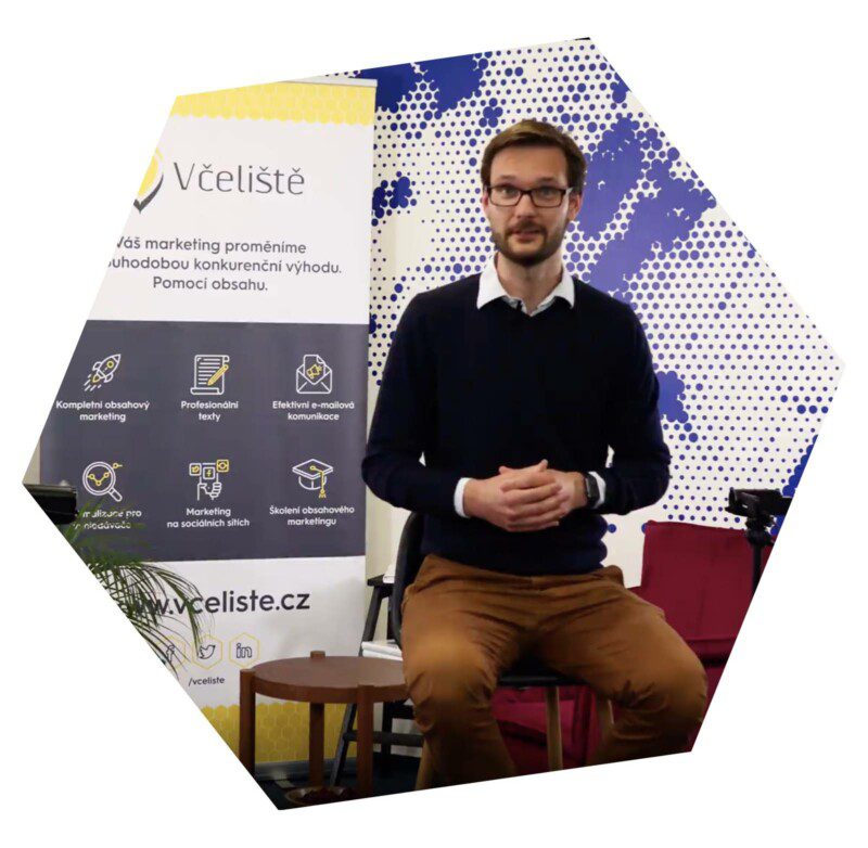 Prezentace o obsahovém marketingu s řečníkem před bannerem Včeliště.