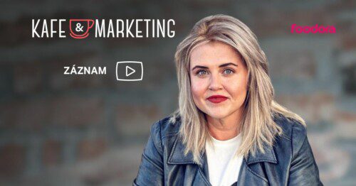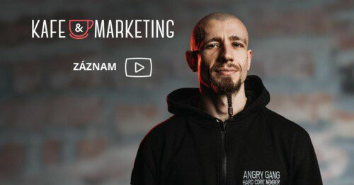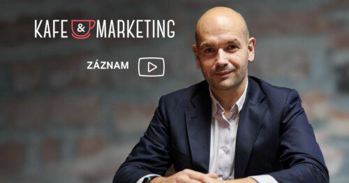 Muž v modrém saku na pozadí s logem Kafe a Marketing a tlačítkem pro přehrání záznamu.