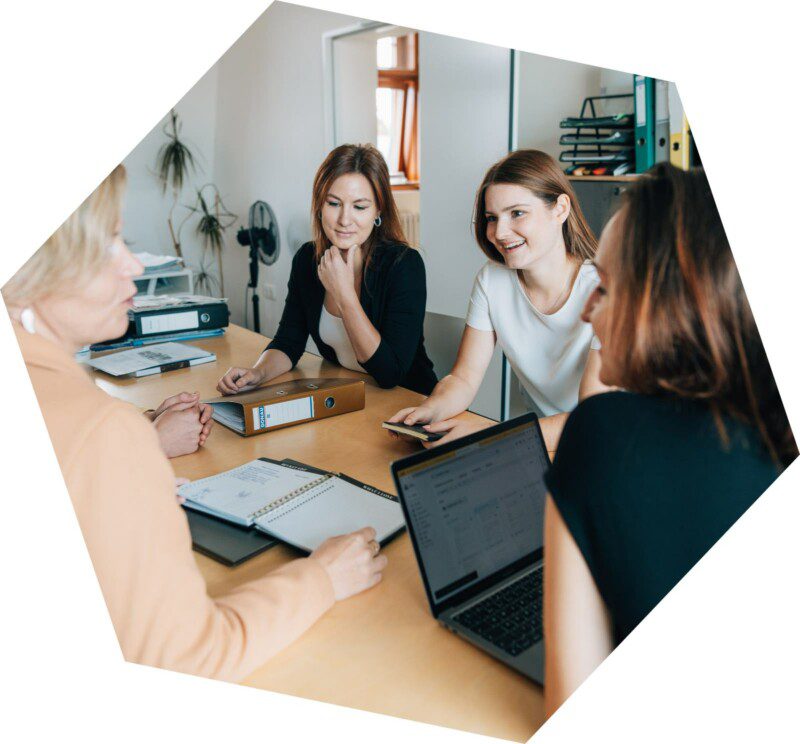 Členové agentury Včeliště sedící u stolu, usmívající se při interním jednání nebo plánování