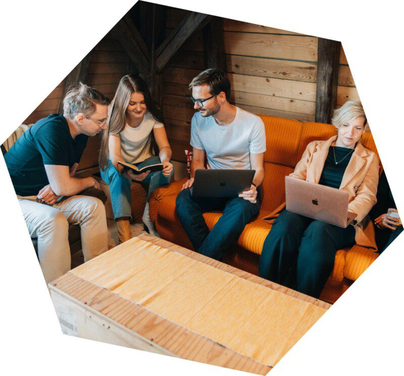 Skupina studentů diskutuje o marketingových strategiích na stáži, sedí na pohovce s notebooky a knihou.