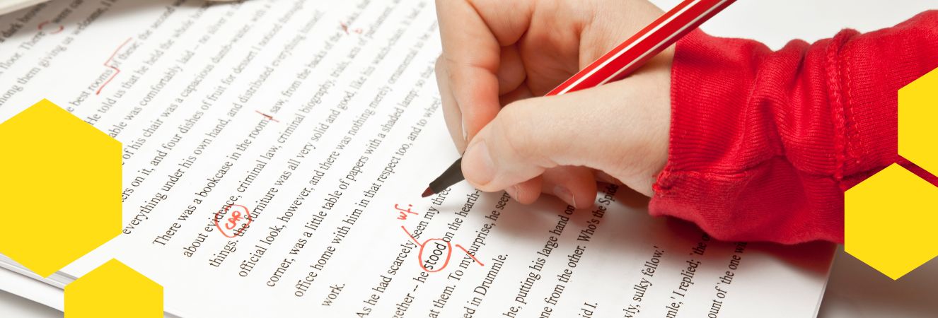 Ruka opravující text s červenou tužkou, zaměřená na pravopisné chyby a čárky.