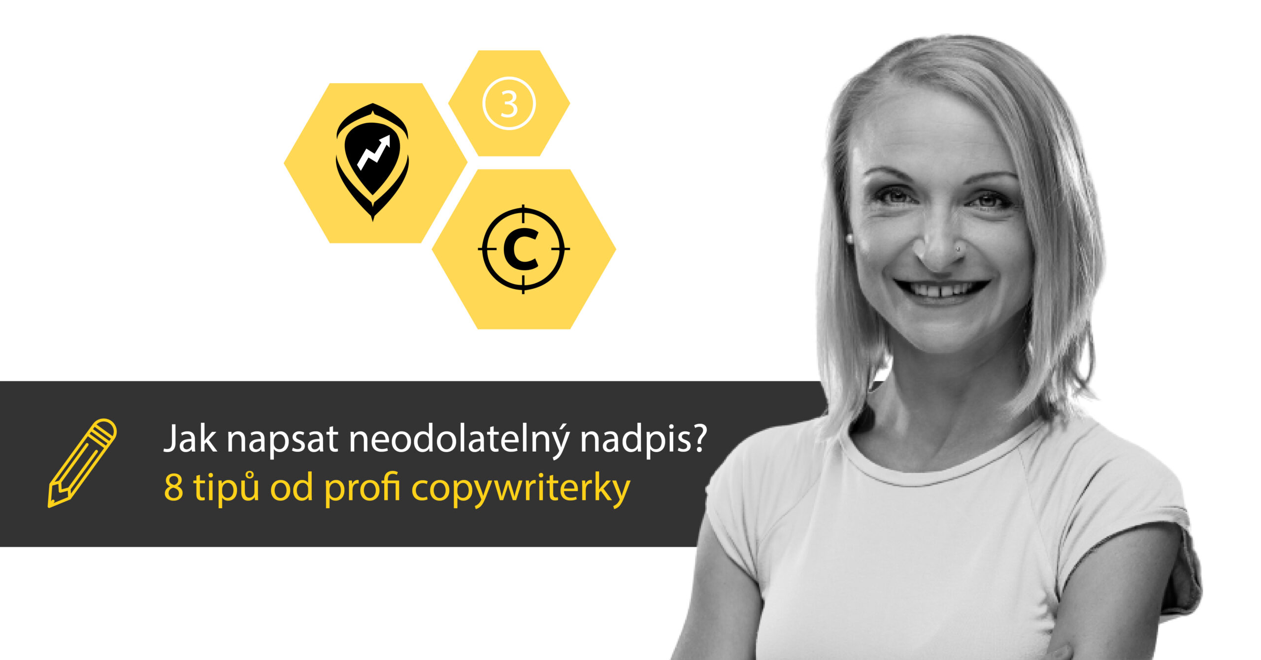 Žena s úsměvem vedle grafiky s textem 'Jak napsat neodolatelný nadpis? 8 tipů od profi copywriterky'.