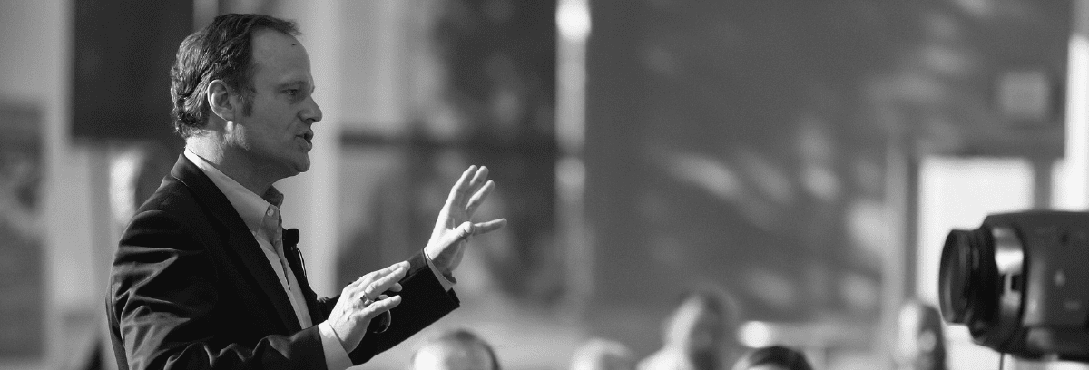 Prezentace na marketingové konferenci s přednášejícím a publikem v pozadí