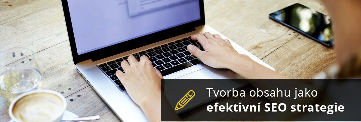 Osoba píše na notebooku, vedle šálek kávy, text Tvorba obsahu jako efektivní SEO strategie.