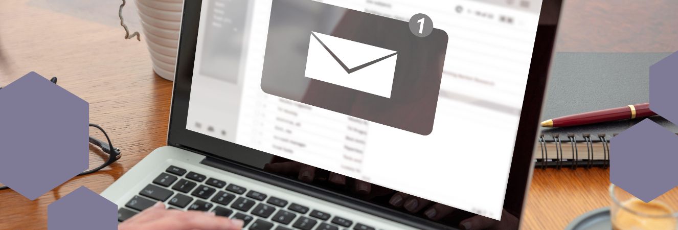 Notebook s otevřeným e-mailovým klientem a ikonou nového e-mailu na obrazovce.