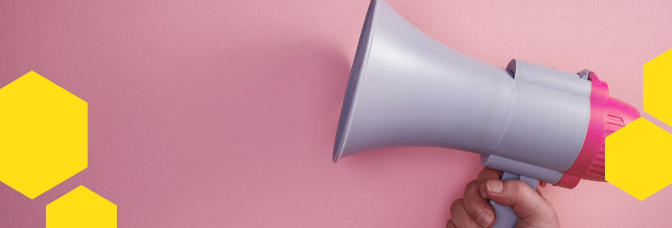 Ruka držící megafon na růžovém pozadí s žlutými šestiúhelníky, symbolizující online marketing a komunikaci.
