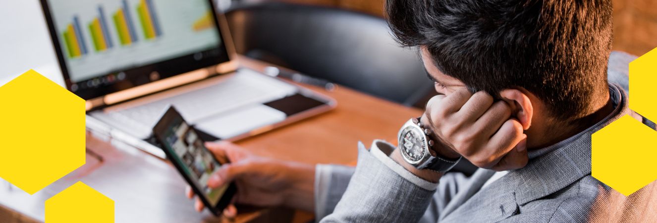 Muž prokrastinuje při práci na notebooku, sleduje mobilní telefon.