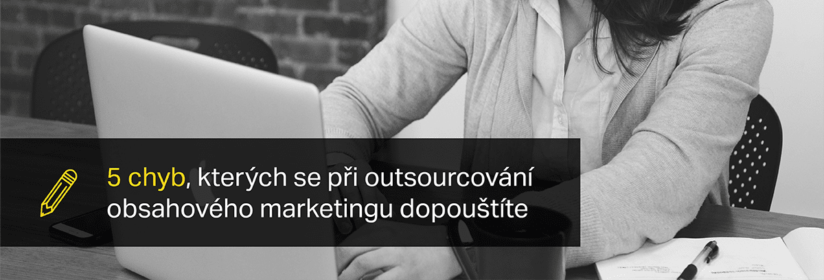 Žena pracující na notebooku s textem o pěti chybách při outsourcování obsahového marketingu.