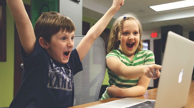 Dvě nadšené děti sledující úspěch na počítači, symbolizující radost z efektivního SEO a online marketingu.