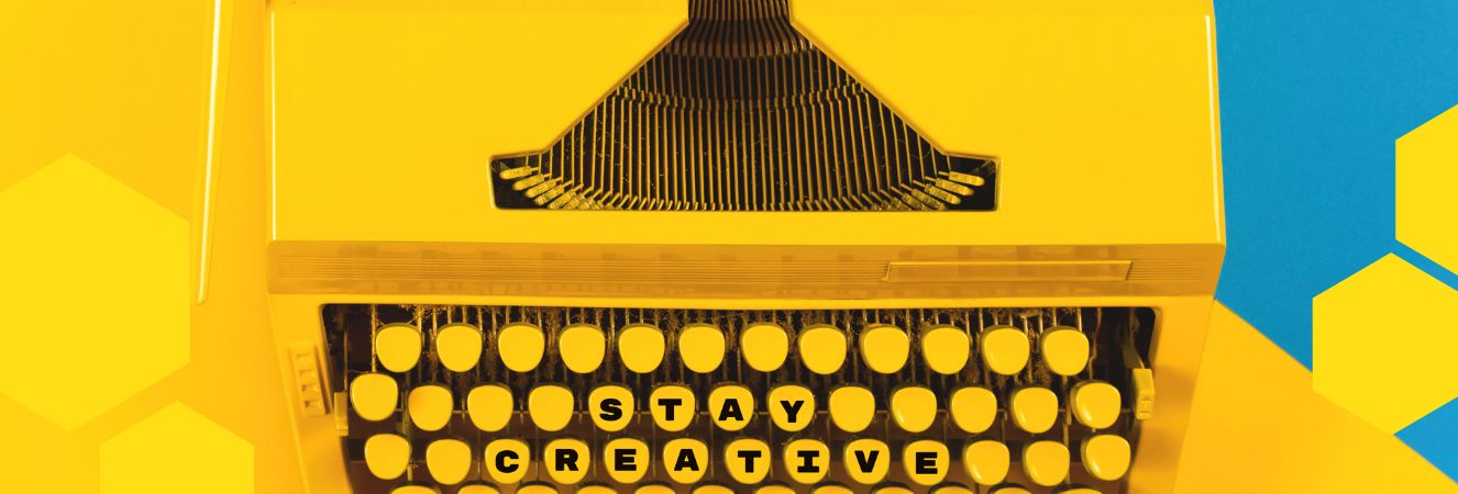 Žlutý psací stroj s nápisem 'Stay Creative' pro podcast o chybách na webu z pohledu copywritera.