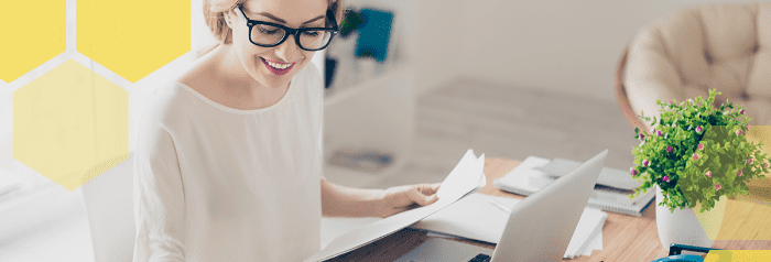 Žena pracující na tvorbě obsahu u stolu s laptopem a dokumenty.