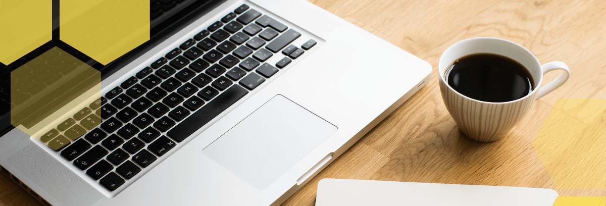 Notebook a šálek kávy na dřevěném stole, symbolizující práci na online marketingu a SEO.