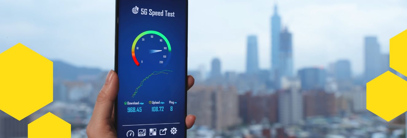 Rychlost internetu na mobilním zařízení s měřením 5G rychlosti na pozadí městské krajiny.